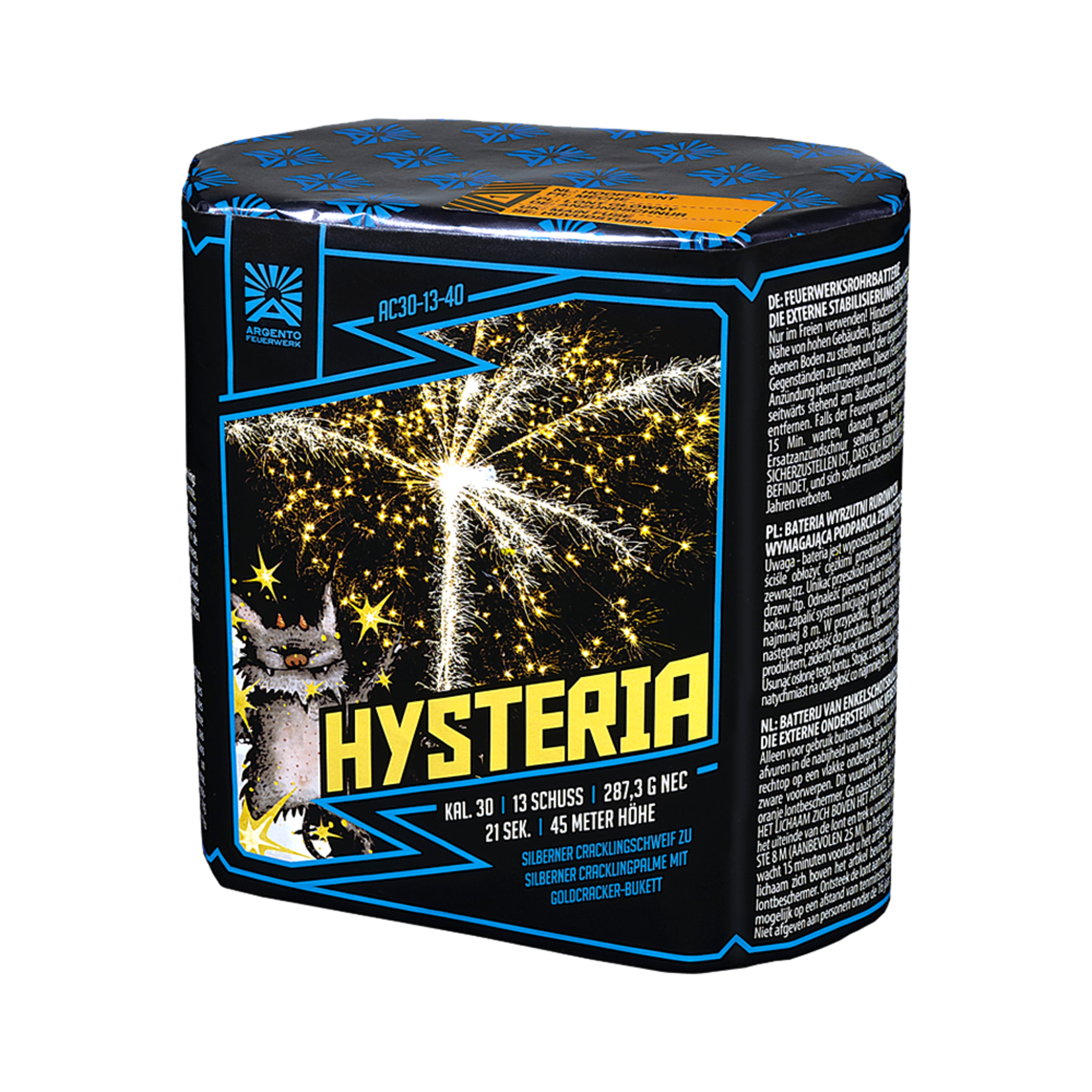 Hysterie von Argento. Silberner Cracker-Schwanz, der zu einer lang brennenden silbernen Cracker-Palme aufsteigt, kombiniert mit einem großen Strauß goldener Cracker.