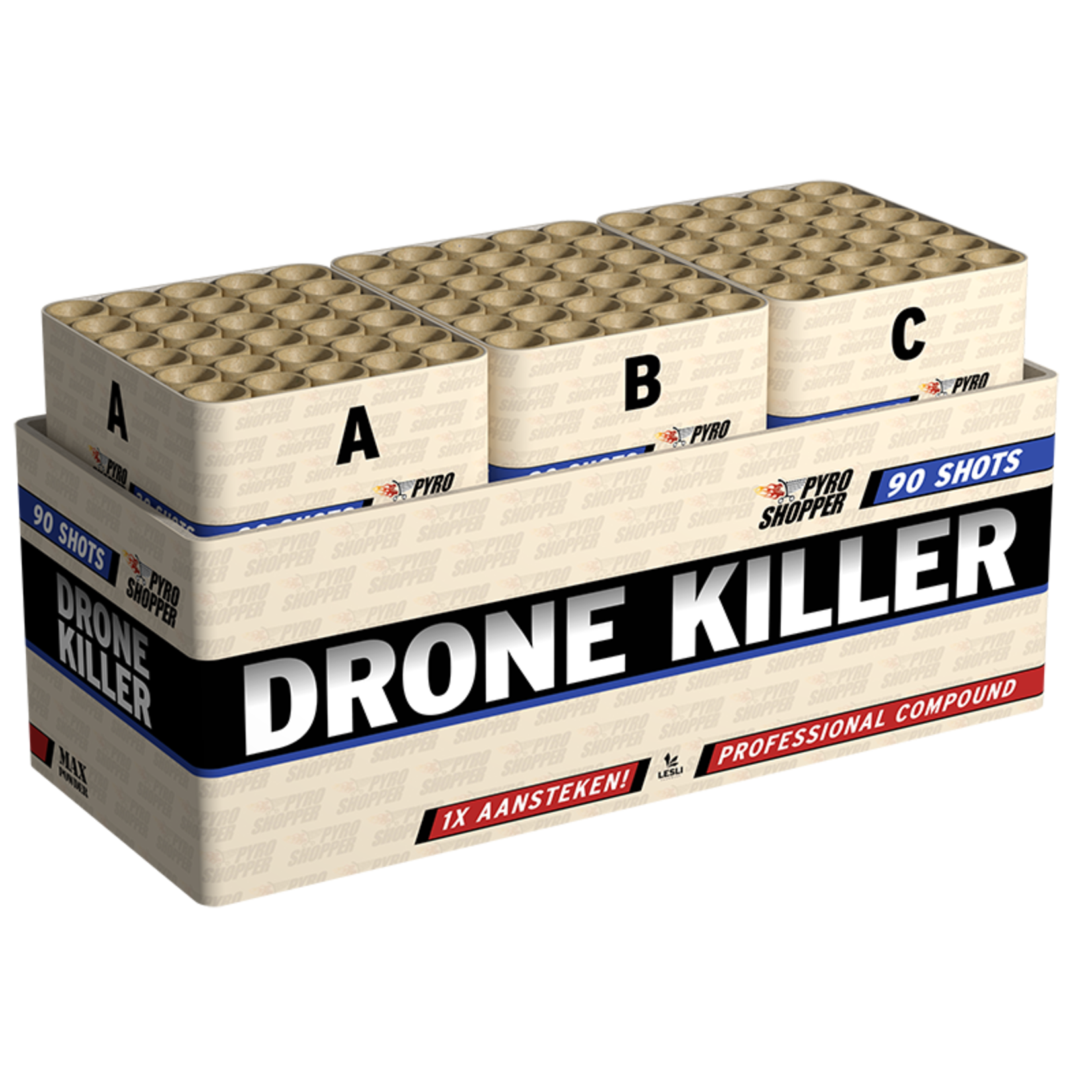 Einmal zünden. Compound-Box mit 3 Cakes und insgesamt 90 Schüssen. Effekte auf mehreren Ebenen im Thema: Blinker.
